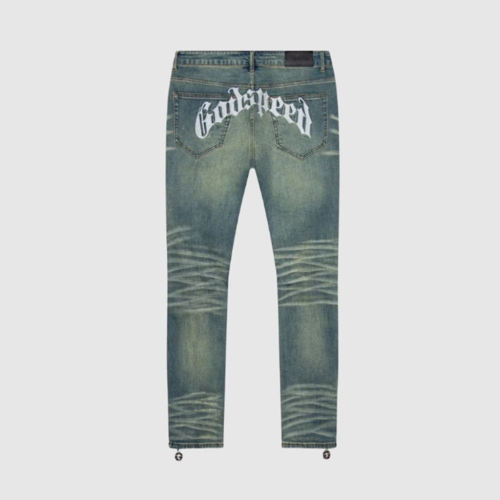 The Godspeed Chain Stitch Denim isn’t just a pair of jeans—it’s a statement. Made from premium cotton denim, this piece combines bold craftsmanship with streetwear culture. What makes it special? The hand-finished chain stitch embroidery—a technique known for its durability and vintage style.