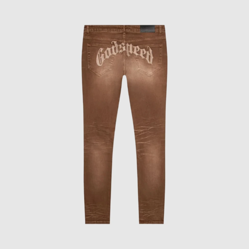 Made from heavy-duty cotton, this denim feels structured but softens with wear. The mid-wash gives it a worn-in look without losing edge, while the fit stays true to modern streetwear—relaxed but sharp. Whether you’re pairing it with a Godspeed shirt or a clean hoodie, the jeans easily become the centerpiece of your outfit.