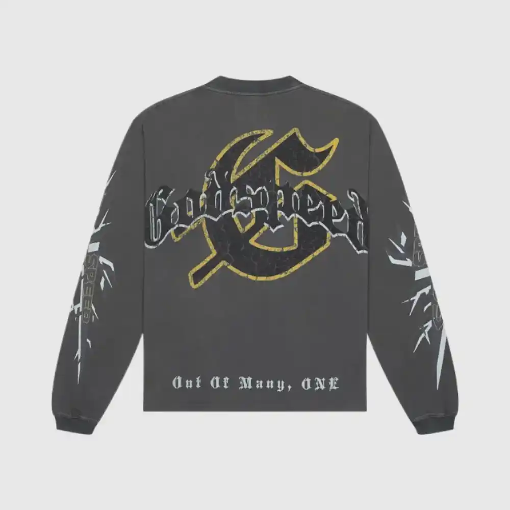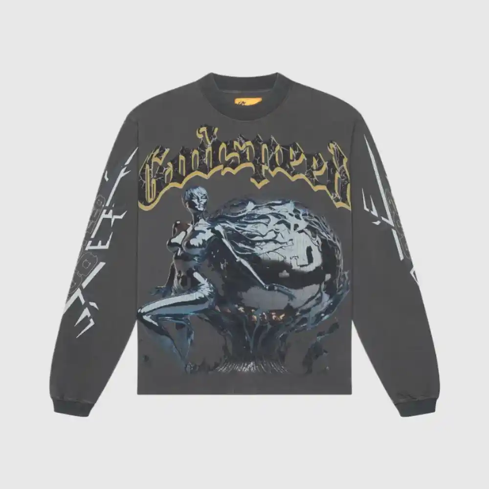 The standout detail? A chrome-effect graphic, either on the back, chest, or sleeves depending on the drop. It catches light subtly—no flashy shine, just enough to elevate the vibe. Perfect if you’re looking for “chrome long sleeve shirt,” “Godspeed metallic print tee,” or “oversized grey and chrome streetwear.”