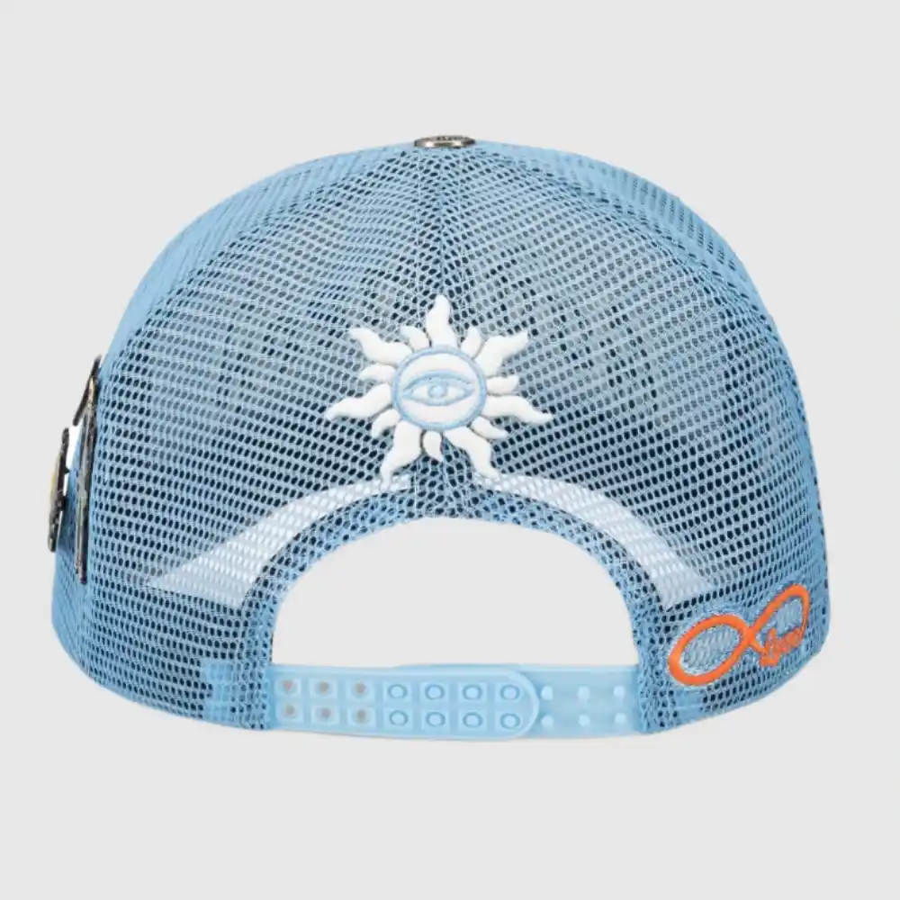 The colors are clear: light blue panels with white mesh and a structured front. If you’re browsing for other caps, check the Godspeed Black Yellow Hat or White and Red Hat.
